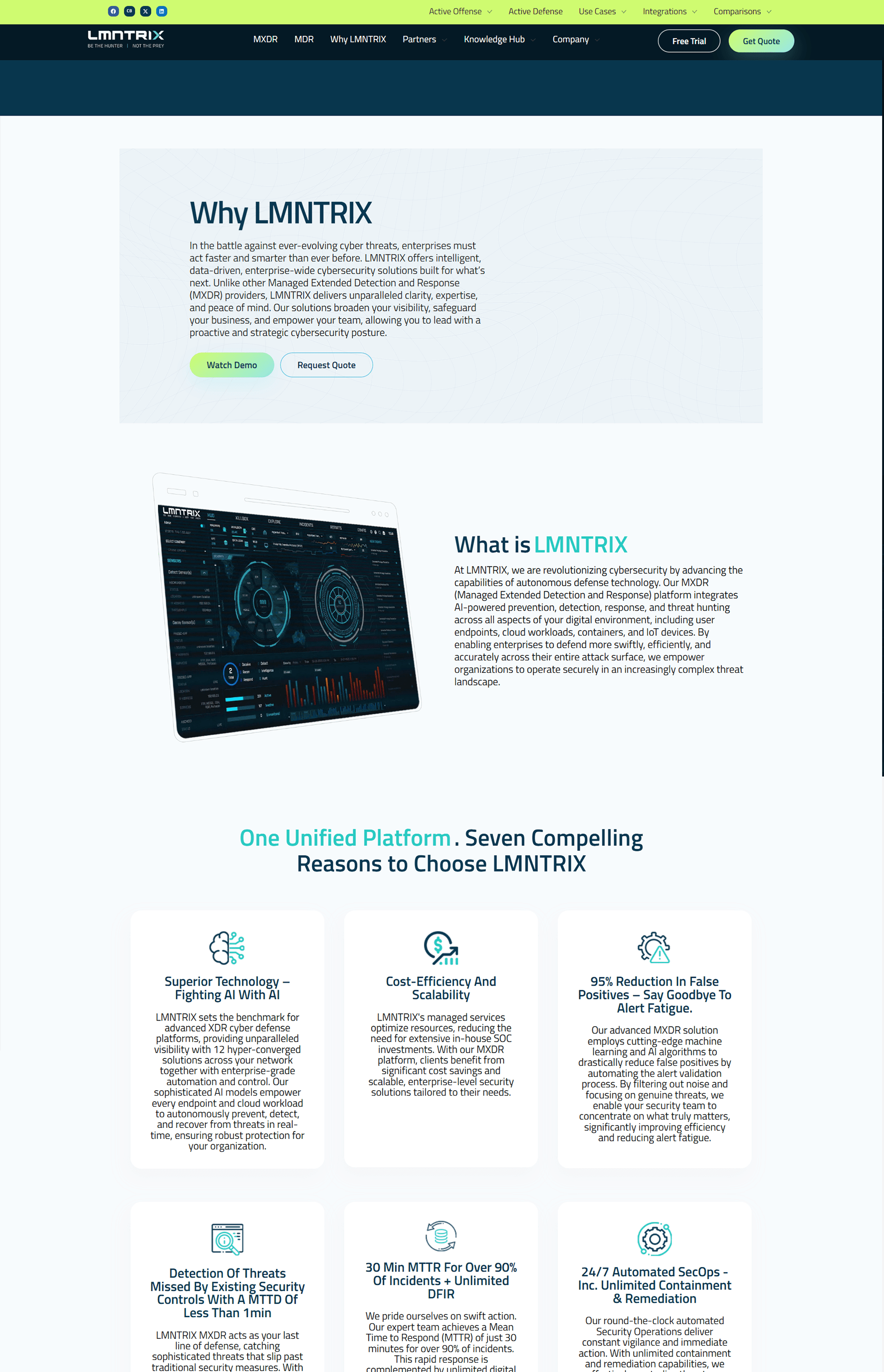 Specializing in cutting-edge threat management solutions, their goal was to communicate trust and authority to businesses seeking robust cyber defense. the aim was to overhaul the website to enhance user trust, streamline content delivery, and boost conversions. LMNTRIX needed a platform that was not only visually engaging but technically secure, reflecting their brand values in every pixel.
